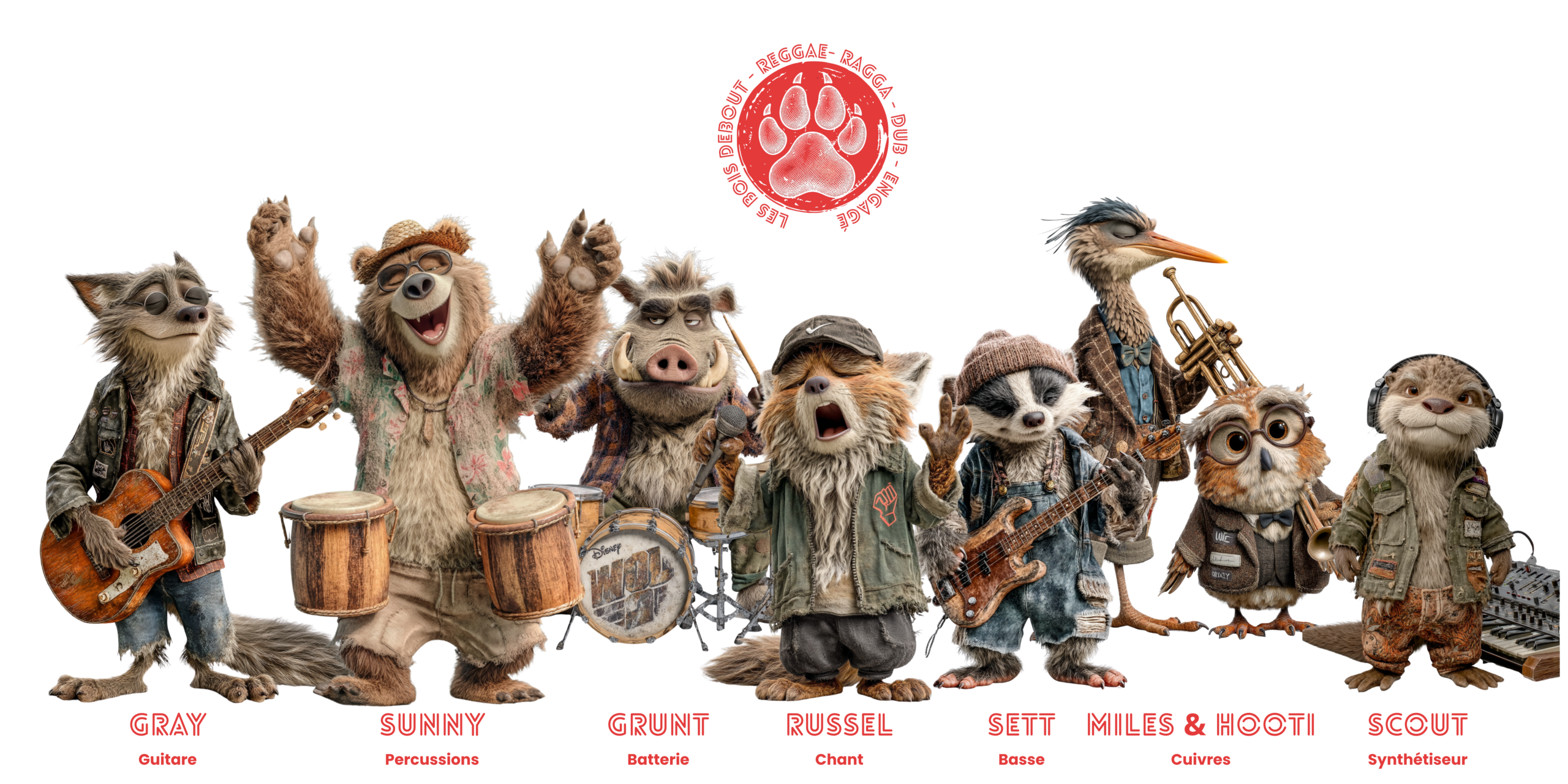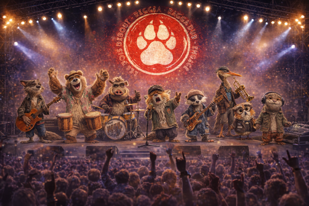 « Les Bois Debout » est ainsi un groupe musical imaginaire composé de huit animaux de la forêt, au style Roots Reggae Ragga Dub engagé. Dans un souci de liberté créative et de narration, l’IA y est en effet personnifiée au travers de huit musiciens animaux dotés chacun d’une personnalité, d’un rôle et d’une histoire.